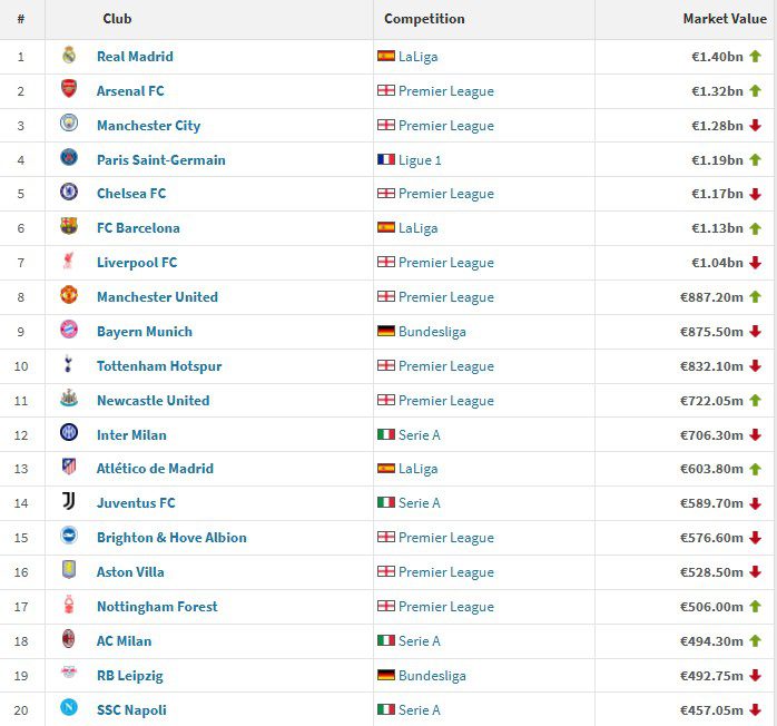 Στην κορυφή της λίστας παραμένει η Ρεάλ Μαδρίτης (1,40 δισ.), με τις Άρσεναλ (1,32 δισ.) και Μάντσεστερ Σίτι (1,28 δισ.) να συμπληρώνουν την τριάδα, ενώ η κυριαρχία της Premier League είναι εμφανής: 10 από τους 20 ακριβότερους συλλόγους εδρεύουν στην Αγγλία.