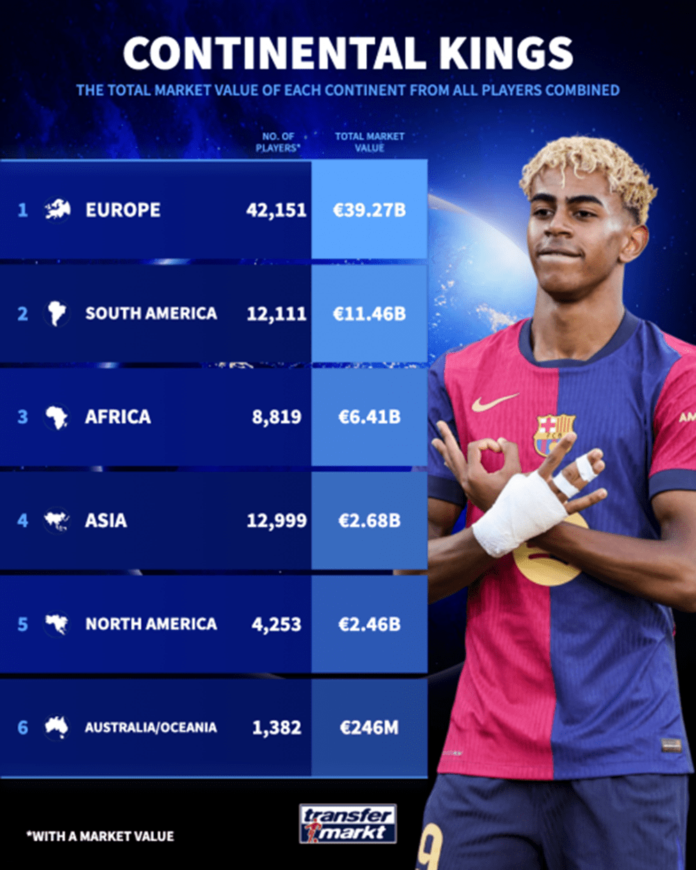 Με συνολική αξία 39,27 δισεκατομμύρια ευρώ και 42.151 ποδοσφαιριστές με αποτίμηση, αφήνει πολύ πίσω κάθε άλλη ήπειρο. Τα κορυφαία πρωταθλήματα, οι τεράστιες επενδύσεις και η συγκέντρωση των μεγαλύτερων ταλέντων, είναι φυσικά ο λόγος της τεράστιας απόστασης.