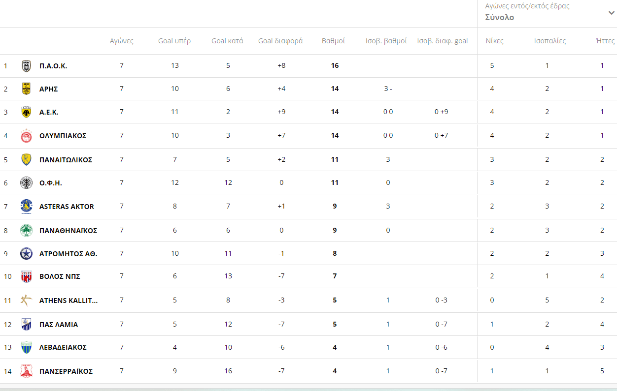 Βαθμολογία Super League: Μετά από 7 αγωνιστικές