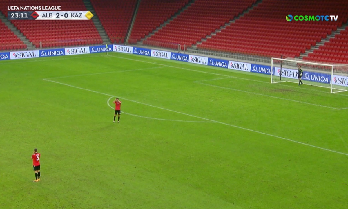 Ένα πολύ σπάνιο γκολ, όχι μόνο λόγω της απόστασης από την οποία μπήκε, αλλά και γιατί σημειώθηκε αμέσως μετά από άλλο γκολ, είδαμε στο ματς Αλβανία – Καζακστάν για το Nations League.