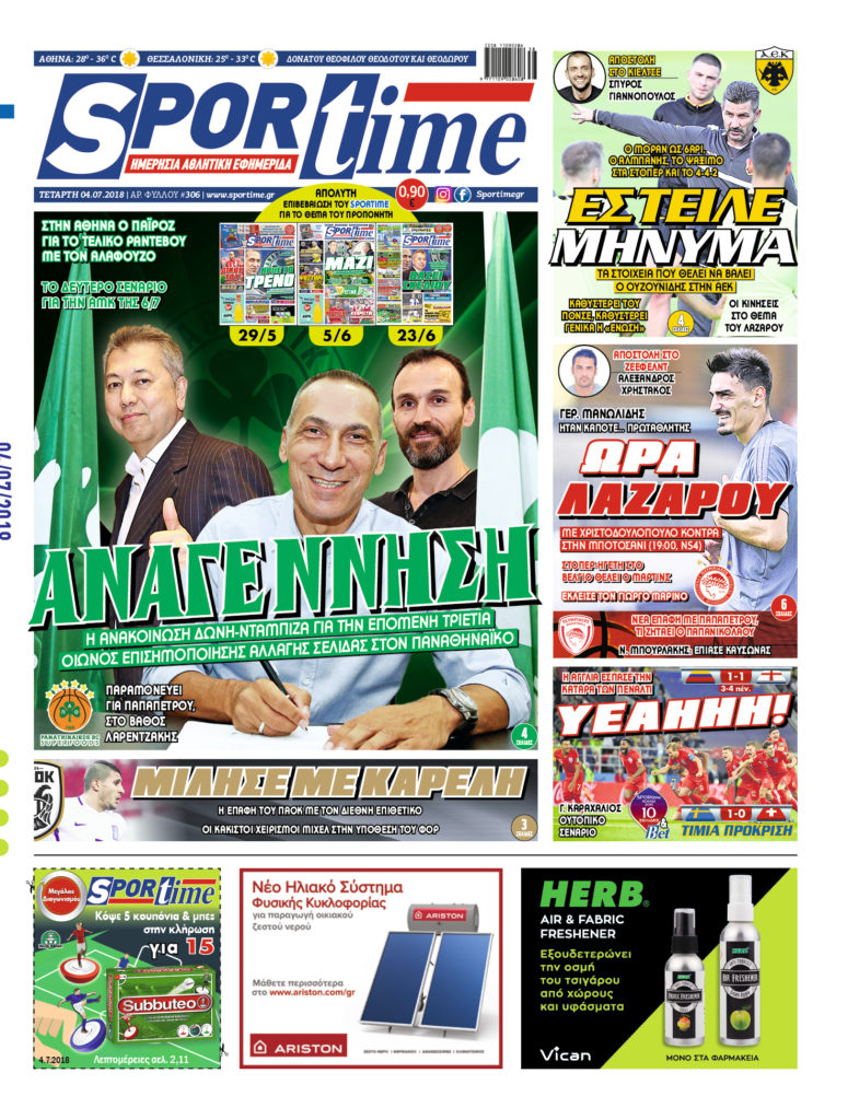 Ηλεκτρονική έκδοση: Sportime πρωτοσέλιδο (4/12): Ψάχνει να βρει την Ιθάκη του ο Θεόδωρος Καρυπίδης όμως το ταξίδι είναι μεγάλο και δύσκολο