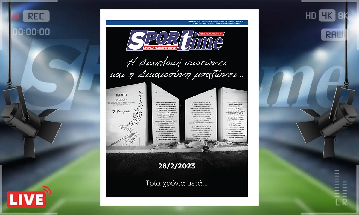 Πρωτοσέλιδο Sportime (28/2): Τέμπη – Η πληγή που δεν έκλεισε ποτέ