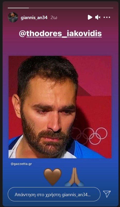 Ο Γιάννης προχώρησε σε ανάρτηση με τη φωτογραφία του Ιακωβίδη στην οποία φαίνεται δακρυσμένος κατά τις δηλώσεις που έκανε στην κάμερα, στην οποία έχει κάνει ταγκ τον 30χρονο αθλητή, ενώ ακόμη έχει βάλει μια καρδιά.