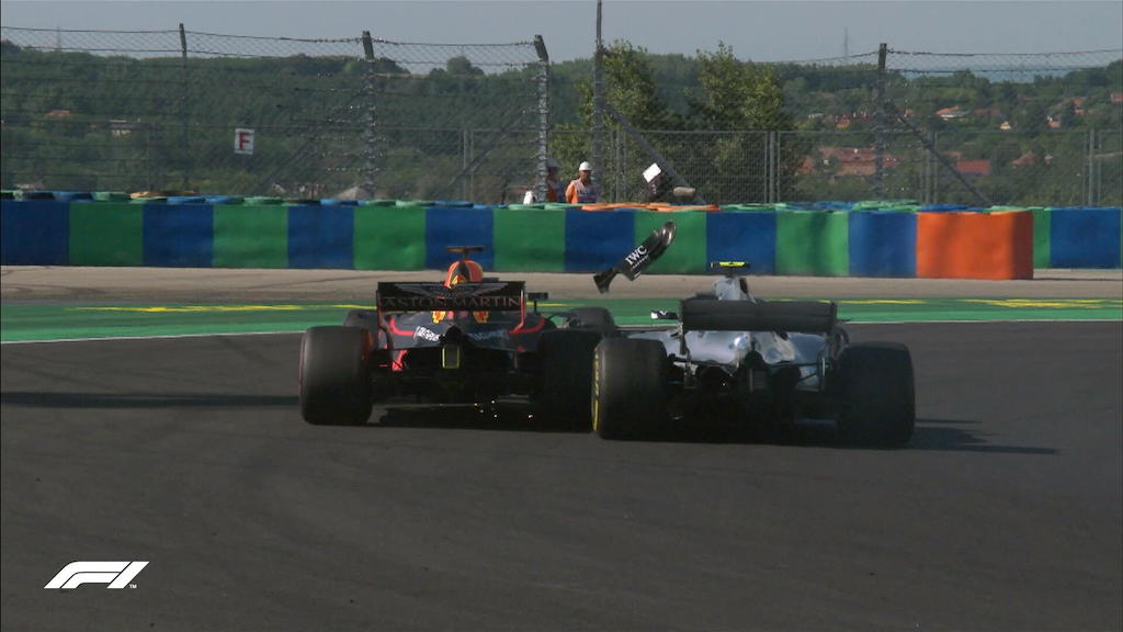 Τελικά, η υπομονή του Φέτελ δεν κράτησε πολύ, όμως η προσπέρασή του θα μπορούσε να χαρακτηριστεί τουλάχιστον… συγκρουσιακή, διαλύοντας ένα σεβαστό μέρος του εμπρός πτερυγίου του Μπότας, που στο μεταξύ ξεκίνησε μία κατρακύλα θέσεων που δεν του άξιζε οδηγικά, ξεκάθαρα ως αποτέλεσμα του “τραυματισμένου” του Ασημί Βέλους.