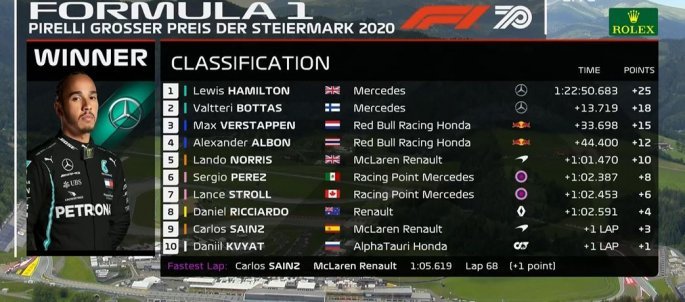 Όπως αναφέρει το ΑΠΕ Βρετανός παγκόσμιος πρωταθλητής Λιούις Χάμιλτον (Mercedes) είδε πρώτος την καρό σημαία στο αυστριακό γκραν πρι, επιστρέφοντας στις νίκες στην πίστα Σπίλμπεργκ ύστερα από τέσσερα χρόνια, αφού τελευταία φορά που το είχε πετύχει στο Red Bull Ring ήταν το 2016. Ο Χάμιλτον εκκίνησε από την πρώτη θέση, έχοντας την pole position και δεν την έχασε ποτέ σε όλη τη διάρκεια της κούρσας.