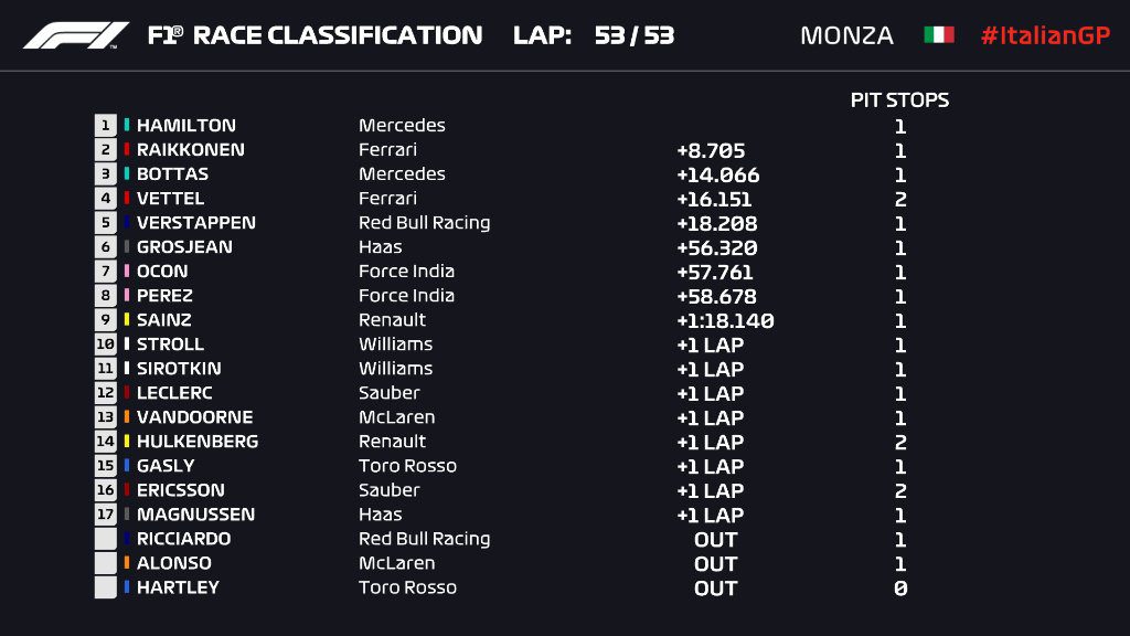 Τα γιουχαΐσματα των tifosi άρχισαν να αντηχούν στην ιταλική πίστα χωρίς καν να έχει γίνει η απονομή. Με τον Χάμιλτον να κάνει το σταυρό του, ο βρετανικός εθνικός ύμνος σηματοδότησε την οριστικοποίηση του αποτελέσματος.