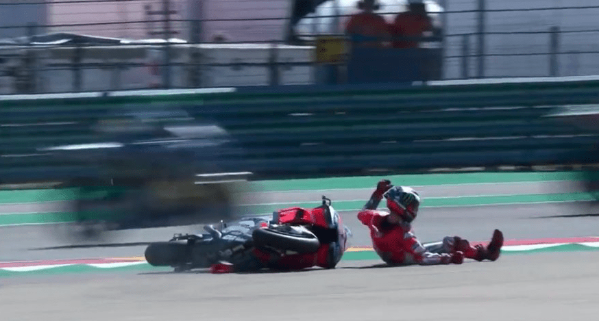 Αιτία, το γεγονός πως ο Ισπανός της Ducati δεν υπολόγισε σωστά το γκάζι του μόλις στην πρώτη στροφή του αγώνα, χάνοντας την ψυχραιμία του καθώς ένιωθε τον Μάρκεθ να τον προσπερνά και τελικά πέφτοντας και υφιστάμενος έναν ελαφρύ τραυματισμό. Οι κάμερες τον έδειξαν να κουτσαίνει καθώς απομακρυνόταν από το σημείο, ενώ για αρκετή ώρα βρισκόταν στο ιατρείο της πίστας, χωρίς να έχουν γίνει περισσότερες λεπτομέρειες γνωστές.