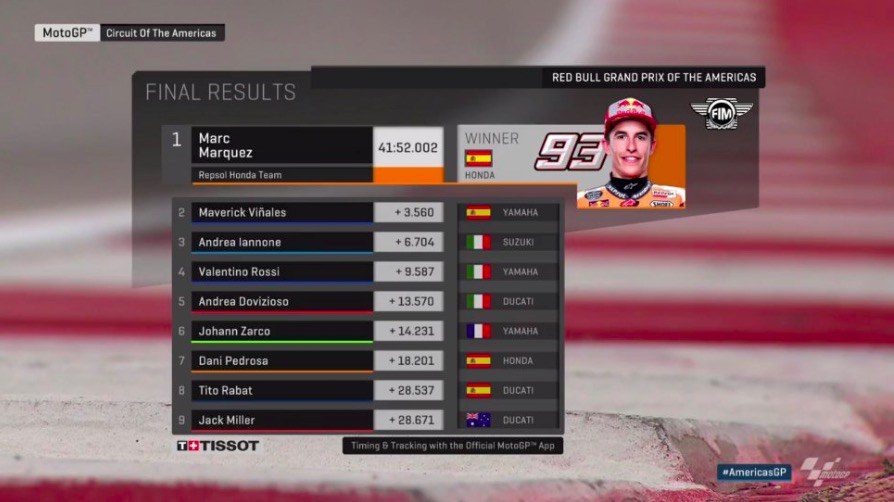 #MotoGP Race 🏁@marcmarquez93 wins his 6th successive #AmericasGP and remains the King of COTA 👑@maverickmack25 takes third and @andreaiannone29 take his first podium with Suzuki pic.twitter.com/6J8ps2Vw2j