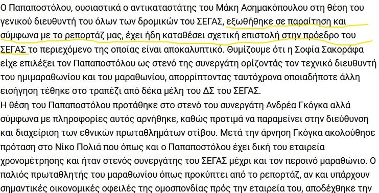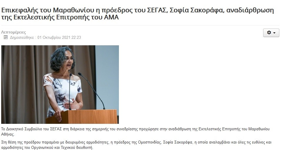 Το Διοικητικό Συμβούλιο του ΣΕΓΑΣ έγινε την περασμένη Παρασκευή και ανακοινώθηκε πως ο αντικαταστάτης του Βαγγέλη Παπαποστόλου είναι η ίδια η πρόεδρος του ΣΕΓΑΣ. Η Σοφία Σακοράφα παίρνει όλες τις αρμοδιότητες του Μαραθωνίου και το οργανωτικό και του τεχνικού διευθυντή.