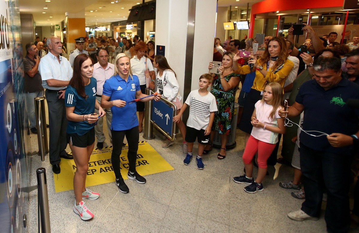 Οι δυο κοπέλες, η πρωταθλήτρια Ευρώπης του επί κοντώ Κατερίνα και η Νικόλ που κατέκτησε το αργυρό μετάλλιο φωτογραφήθηκαν με τα… μενταγιόν τους. Τις υποδέχθηκε στο αεροδρόμιο ο Βασίλης Σεβαστής, ενώ καταχειροκροτήθηκαν από τον κόσμο που ήταν εκεί και τις φωτογράφιζε.