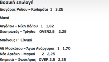Ιάλυσος – Διαγόρας: Το νησιώτικο ντέρμπι είναι από τα ματς που ξεχωρίζουν. Ο Ιάλυσος ηττήθηκε δύσκολα στη Νίκαια και έδωσε συνέχεια στα άσχημα εκτός έδρας αποτελέσματα. Ο Διαγόρας επικράτησε της Καλαμάτας με 2-0 και συμπλήρωσε τρία ματς αήττητος. Δύσκολα θα ανοίξει το ματς, αφού αμφότεροι θέλουν να μην χάσουν, κυρίως η ομάδα του Νίκου Καραμπετάκη που παρουσιάζει μεγάλο πρόβλημα στο σκοράρισμα. Το under 2,5 είναι χαμηλό.