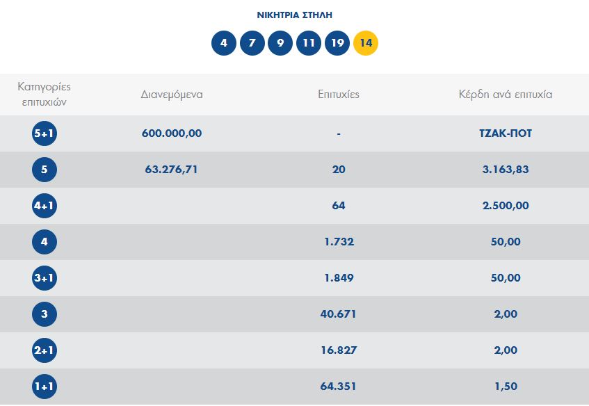 Οι τυχεροί αριθμοί της Πέμπτης είναι οι: 4, 7, 9, 11, 19 και Τζόκερ το 14.