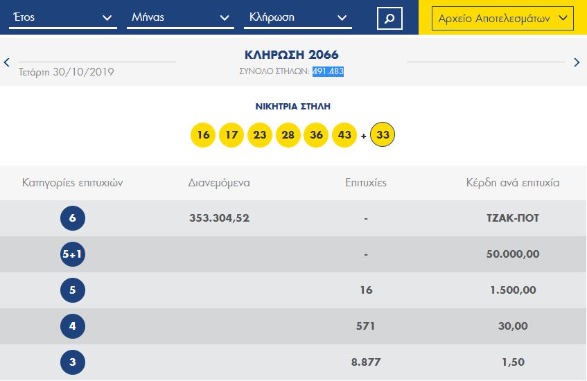 Συνολικά παίχτηκαν 491.483 στήλες και είχαμε ΤΖΑΚ-ΠΟΤ. Δεν υπήρξε ούτε ένας που να βρήκε 5+1. Από 1.500 ευρώ πήραν 16 άτομα έχοντας βρει πέντε αριθμούς.
