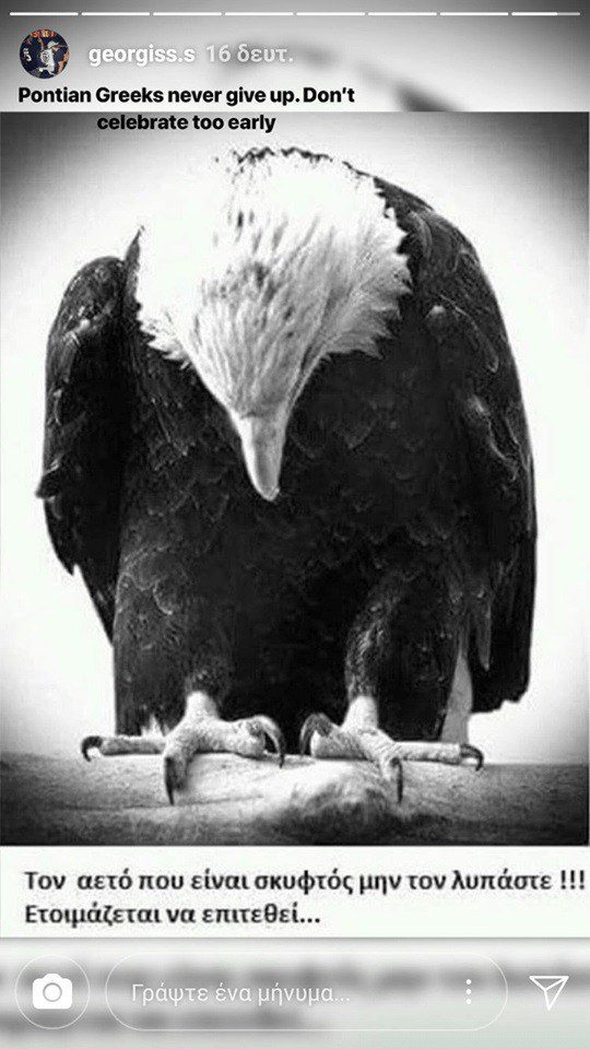 «Οι πόντιοι δεν τα παρατάνε ποτέ. Μη γιορτάζετε τόσο γρήγορα. Τον αετό που είναι σκυφτός μην τον λυπάστε!!! Ετοιμάζεται να επιτεθεί», έγραψε χαρακτηριστικά, αναρτώντας μια φωτογραφία με έναν αετό.
