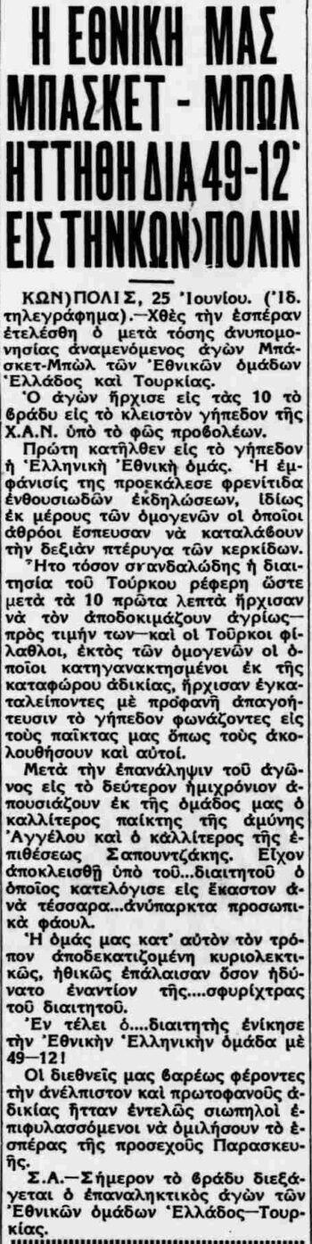 Το παιχνίδι έγινε στις εγκαταστάσεις της YMCA, σε κλειστό γήπεδο και υπό το φως των προβολέων. Πράγματα πρωτόγνωρα για τους Έλληνες. Τελικά οι Τούρκοι επικράτησαν με 49-12 και κάπως έτσι καταγράφηκε ο πρώτος αγώνας για την Εθνική ομάδα.