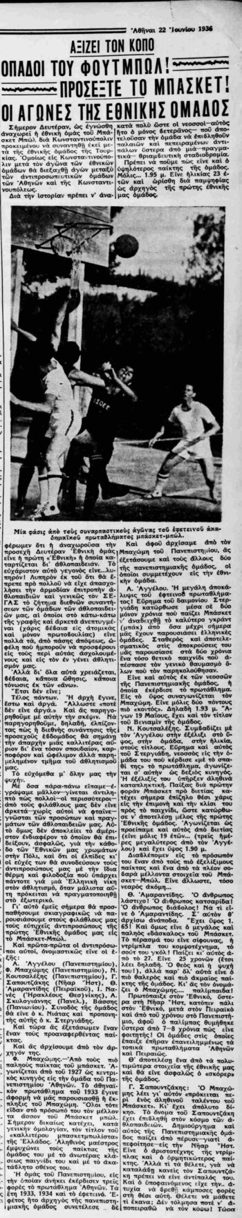 Στο δημοσίευμα που ακολουθεί με τίτλο «Αξίζει τον κόπο οπαδοί του φούτμπωλ! Προσέξτε το μπάσκετ» από την εφημερίδα «Αθλητισμός» της 22ας Ιουνίου του 1936 μπορείτε να δείτε μια αναλυτική και… απολαυστική παρουσίαση εκείνης της πρώτης Εθνικής.