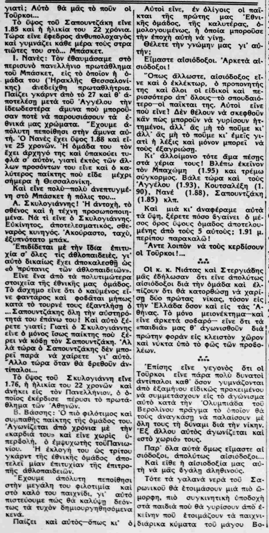 Στο δημοσίευμα που ακολουθεί με τίτλο «Αξίζει τον κόπο οπαδοί του φούτμπωλ! Προσέξτε το μπάσκετ» από την εφημερίδα «Αθλητισμός» της 22ας Ιουνίου του 1936 μπορείτε να δείτε μια αναλυτική και… απολαυστική παρουσίαση εκείνης της πρώτης Εθνικής.