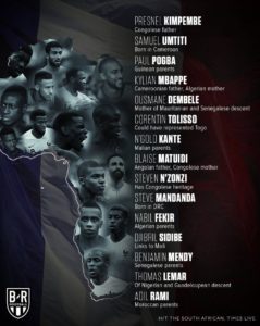 Ωστόσο υπάρχει μία που έχει φτάσει μέχρι τον τελικό της Μόσχας και εκπροσωπεί κάτι περισσότερο ένα έθνος, τις ελπίδες μιας ολόκληρης ηπείρου. Η Γαλλία είναι η πιο πολυπολιτισμική ομάδα της διοργάνωσης, η… έκτη αφρικανική ομάδα και η καλύτερη. 15 από τους 23 παίκτης της αποστολής των «τρικολόρ» έχουν ρίζες στην Αφρική. Η γενιά τους είναι βέβαια παιδιά μεταναστών, οι ίδιοι έχουν (στην πλειοψηφία τους) γεννηθεί και μεγαλώσει στην χώρα την οποία εκπροσωπούν επάξια στο Παγκόσμιο Κύπελλο.