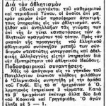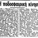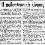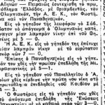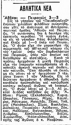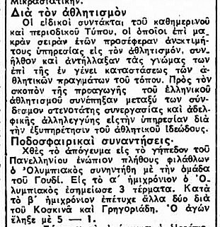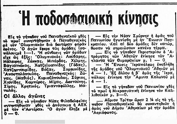 - Στο γήπεδο του Παναθηναϊκού έγινε το ντέρμπι του Πειραιά ανάμεσα στον Ολυμπιακό και τον Εθνικό. «Δι ενός ισχυρού εξ αποστάσεως σουτ του δεξιού μέσου Χατζησταυρίδη εσημειώθη το νικητήριον τέρμα» διαβάζουμε χαρακτηριστικά για την νίκη του Ολυμπιακού με 1-0.
