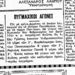 - 17 Iανουαρίου 1944: Και πυγμαχικούς αγώνες είχαμε και μάλιστα ενημέρωνε η εφημερίδα ότι ο βαλκανιονίκης Καμπάφλης κατάφερε να νικήσει τον διάσημο Καρπόζηλο σε αγώνα που έγινε στο Καλλιμάρμαρο Στάδιο… Συν την ενημέρωση για φιλανθρωπίες προς τους βομβόπληκτους του Πειραιά.