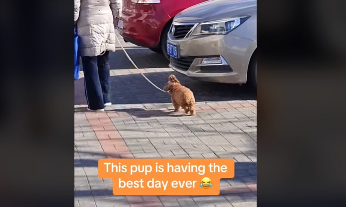 Ένα κουτάβι κάνει βόλτα στον δρόμο και δείχνει το πόσο χαρούμενο είναι με τον πιο εμφατικό τρόπο.