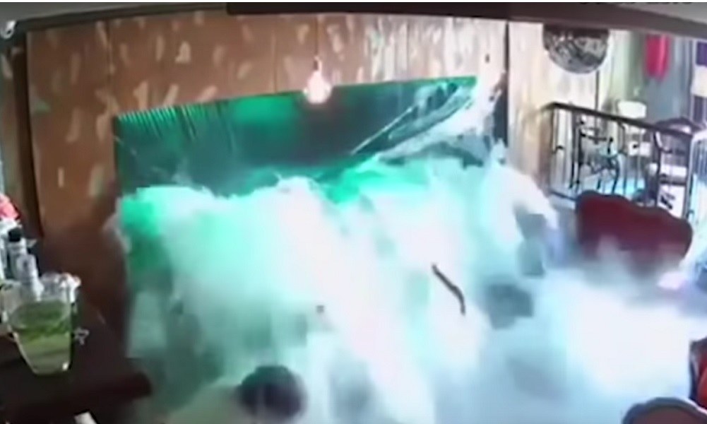 Το υλικό από την κάμερα ασφαλείας του καταστήματος είναι εντυπωσιακό και δείχνει πως μπορεί μία κατάσταση να διαφοροποιηθεί από τη μία στιγμή στην άλλη. Και από εκεί που ανέμελος απολαμβάνεις τον καφέ σου και συζητάς, την επόμενη προσπαθείς να καταλάβεις τι έχει συμβεί. Και είσαι και βρεγμένος μέχρι το… κόκκαλο!