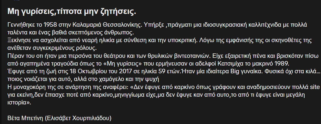 Οι αδελφοί Κατσιμίχα είναι από τους πιο αγαπημένους Έλληνες τραγουδοποιούς της χώρας, ωστόσο μία από τις μεγαλύτερες επιτυχίες τους, το «Μη γυρίσεις» δεν το έχουν γράψει οι ίδιοι, αλλά η επίσης αγαπημένη ηθοποιός Βέτα Μπετίνη.