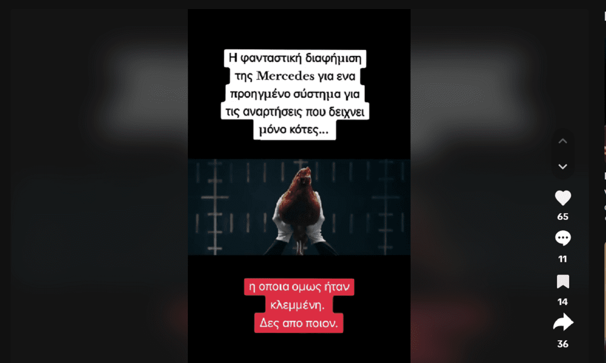 Το παρακάτω βίντεο στο TikTok υποστηρίζει οτι μια διαφήμιση της Mercedes που χρησιμοποιεί κότες για να αναδείξει την σταθερότητα και τα κρατήματα των αυτοκινήτων θυμίζει πολύ την αντίστοιχη διαφήμιση μιας άλλης εταιρείας.