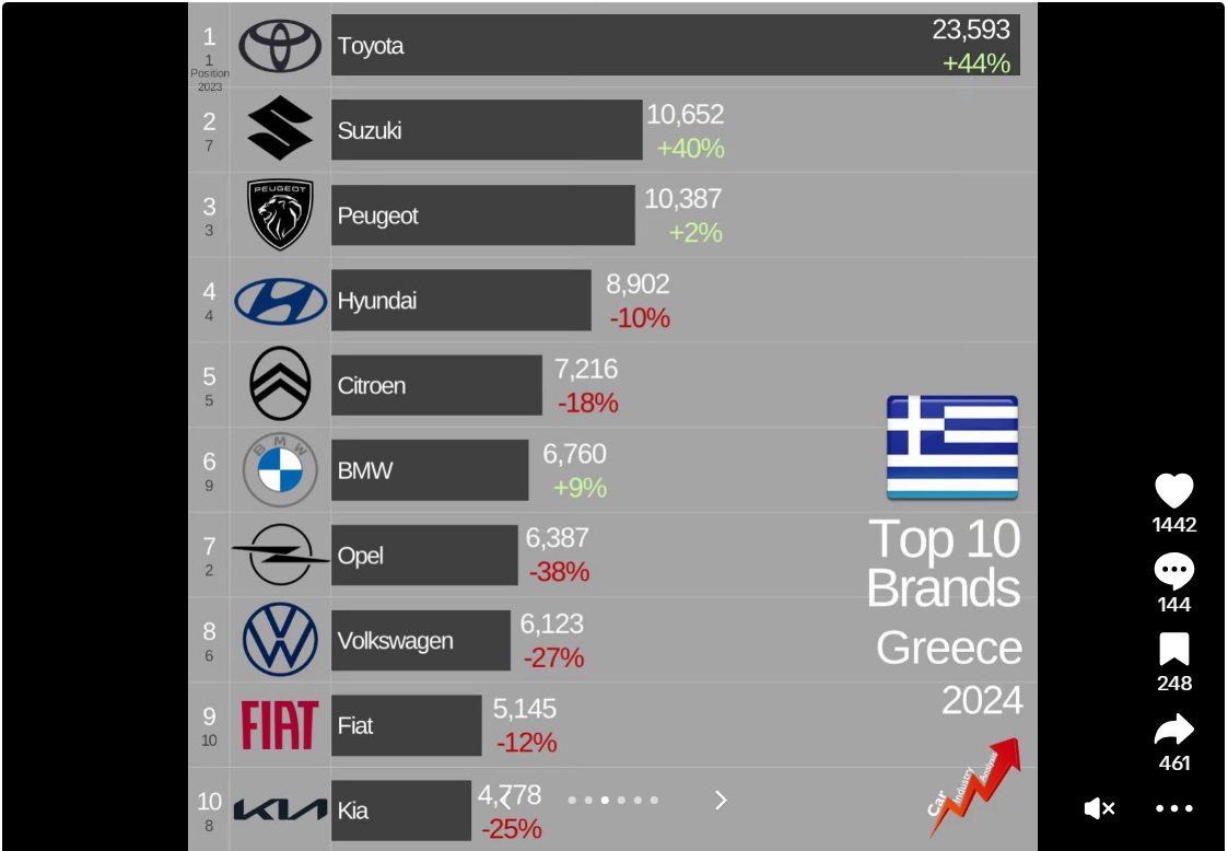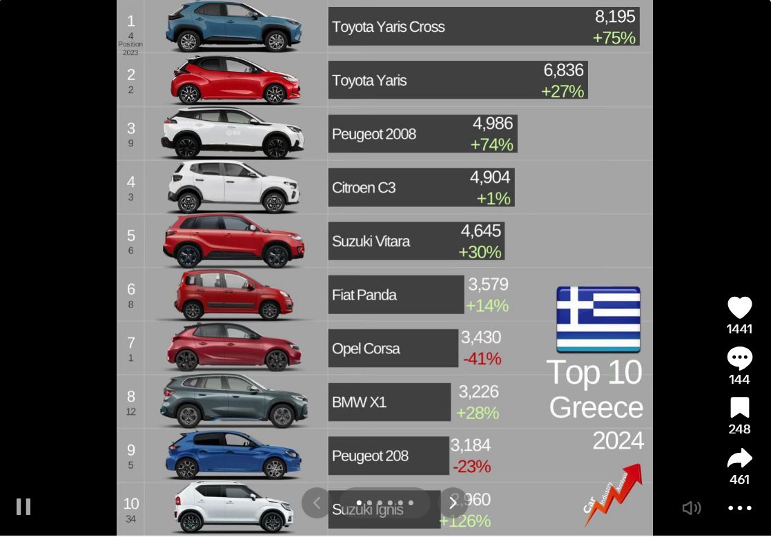 Ποια μάρκα αυτοκινήτου αγόρασαν περισσότερο οι Έλληνες το 2024; Σύμφωνα με ανάρτηση σε κανάλι του TikTok «Η Toyota είναι ο μεγάλος νικητής στην Ελλάδα».