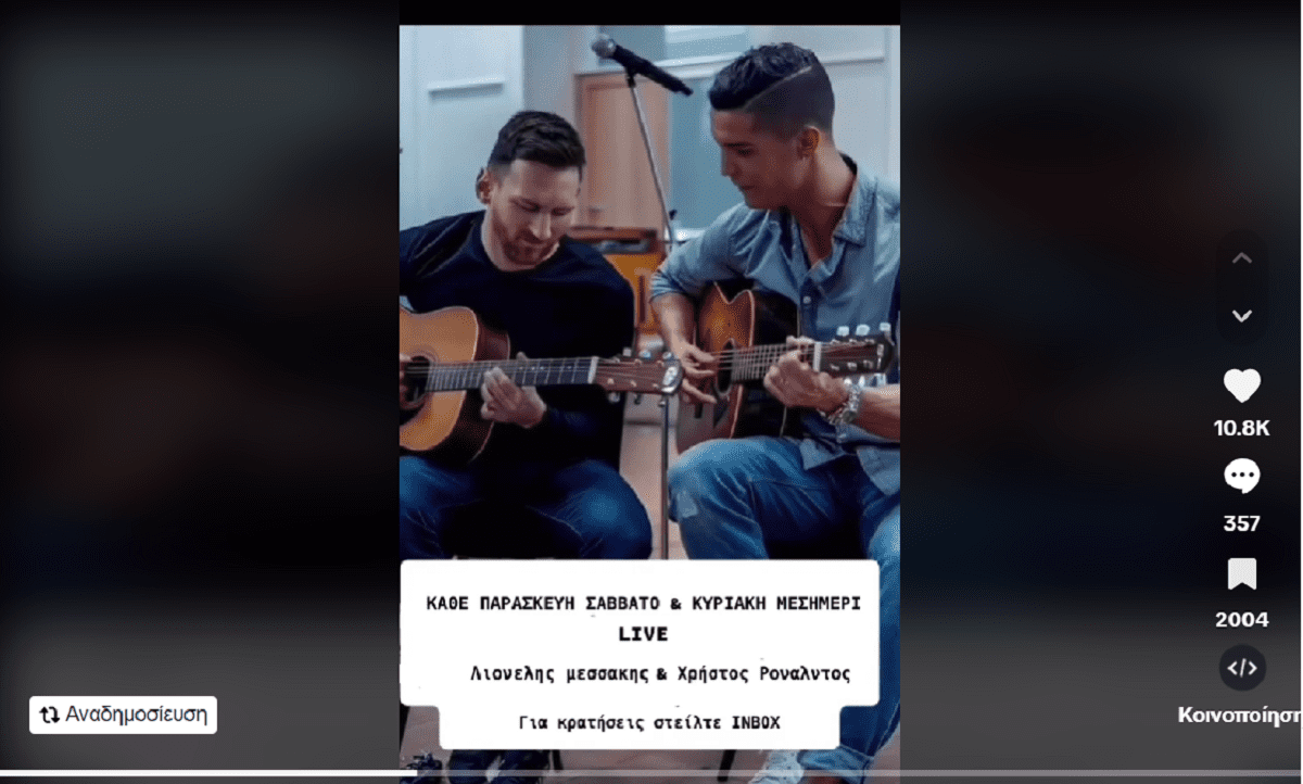 Τις τελευταίες ημέρες κυκλοφορεί επικό βίντεο στο TikTok το οποίο τους «Λιονέλ Μέσι» και «Κριστιάνο Ρονάλντο» να παίζουν μαζί μουσική. Μάλιστα στην… ελληνική του έκδοση ακούγεται να παίζουν ένα κομμάτι του Γιώργου Νταλάρα.