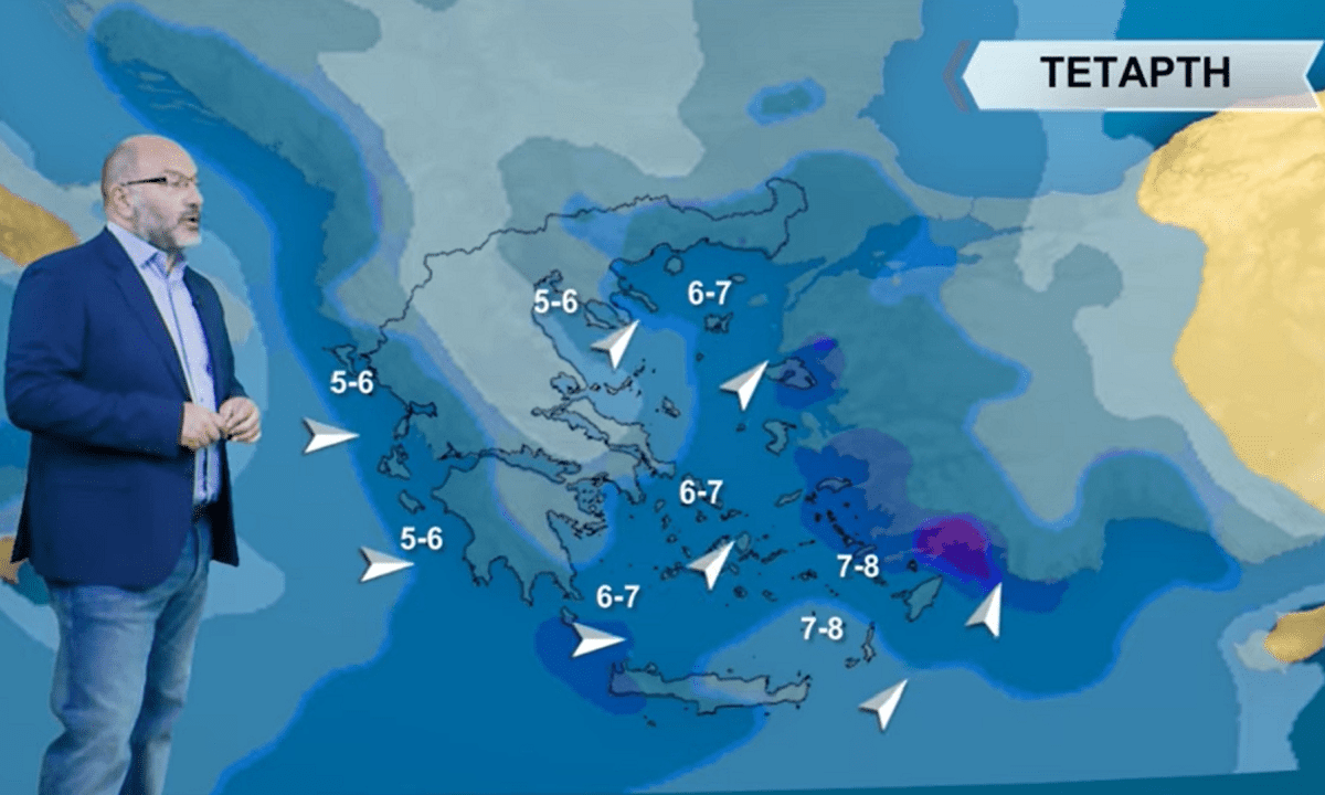 Οι άνεμοι στα δυτικά θα πνέουν από δυτικές διευθύνσεις 5 με 7 μποφόρ και στα ανατολικά θα πνέουν από νότιες διευθύνσεις 5 με 7 και στο Αιγαίο τοπικά 8 μποφόρ με σταδιακή εξασθένηση.