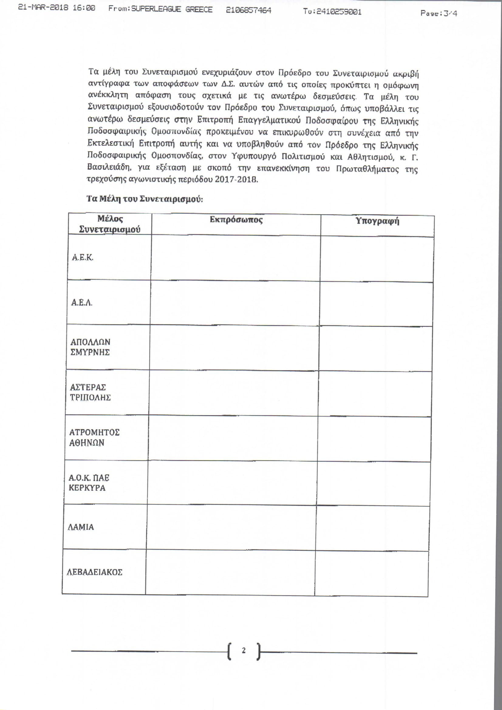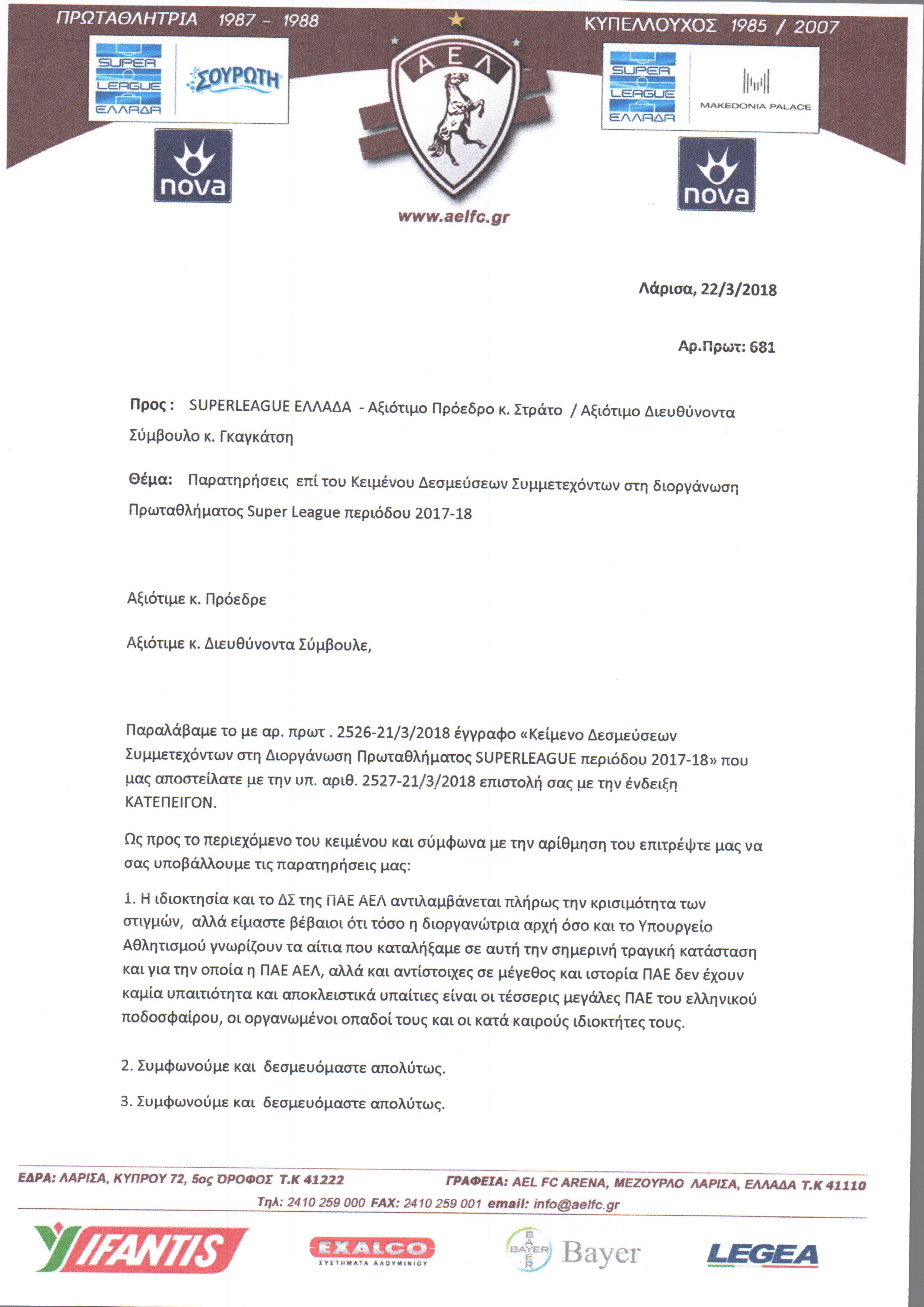 Παραλάβαμε το με αρ. πρωτ . 2526-21/3/2018 έγγραφο «Κείμενο Δεσμεύσεων Συμμετεχόντων στη Διοργάνωση Πρωταθλήματος SUPERLEAGUEπεριόδου 2017-18» που μας αποστείλατε με την υπ. αριθ. 2527-21/3/2018 επιστολή σας με την ένδειξη ΚΑΤΕΠΕΙΓΟΝ.