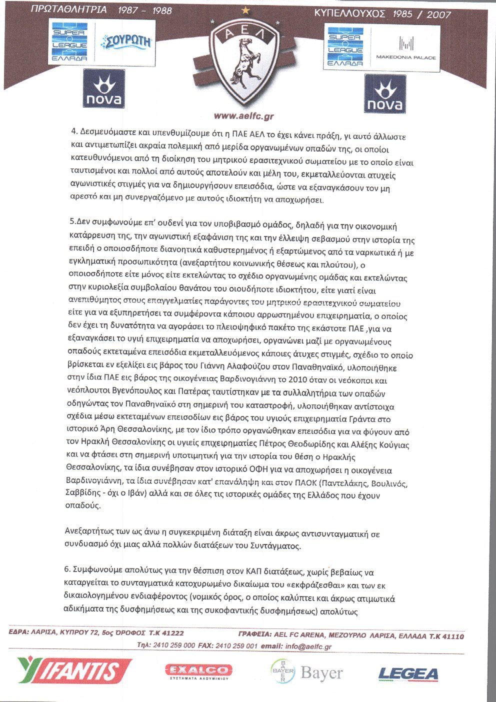 Ανακοίνωση-απάντηση της ΑΕΛ στην Super League (pics)