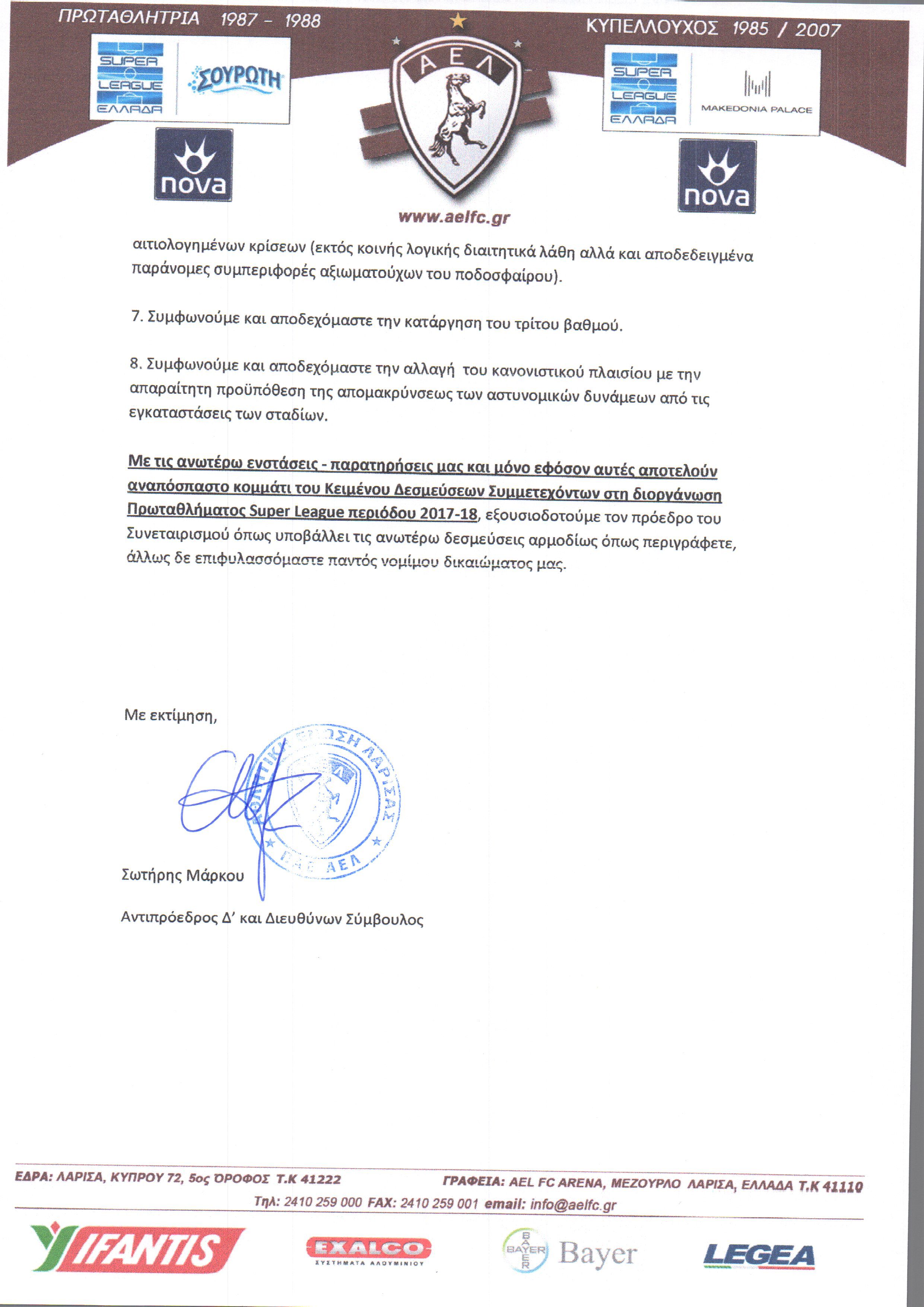 Με τις ανωτέρω ενστάσεις – παρατηρήσεις μας και μόνο εφόσον αυτές αποτελούν αναπόσπαστο κομμάτι του Κειμένου Δεσμεύσεων Συμμετεχόντων στη διοργάνωση Πρωταθλήματος SuperLeagueπεριόδου 2017-18, εξουσιοδοτούμε τον πρόεδρο του Συνεταιρισμού όπως υποβάλλει τις ανωτέρω δεσμεύσεις αρμοδίως όπως περιγράφετε, άλλως δε επιφυλασσόμαστε παντός νομίμου δικαιώματος μας.